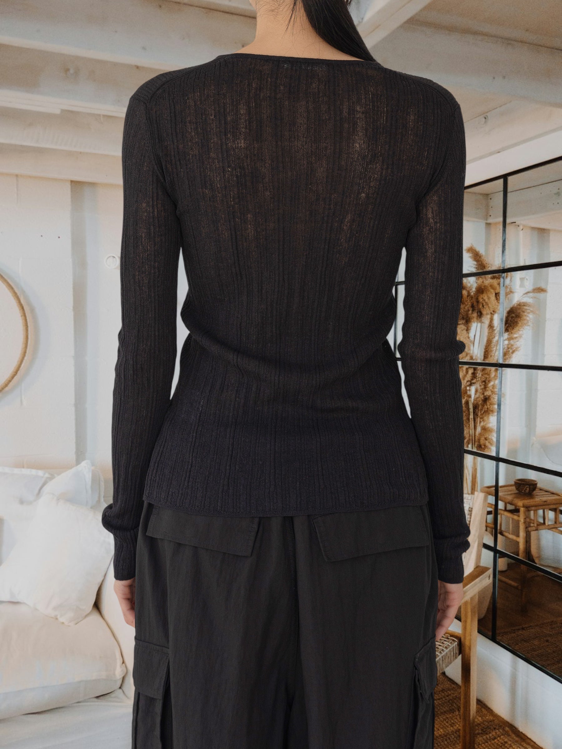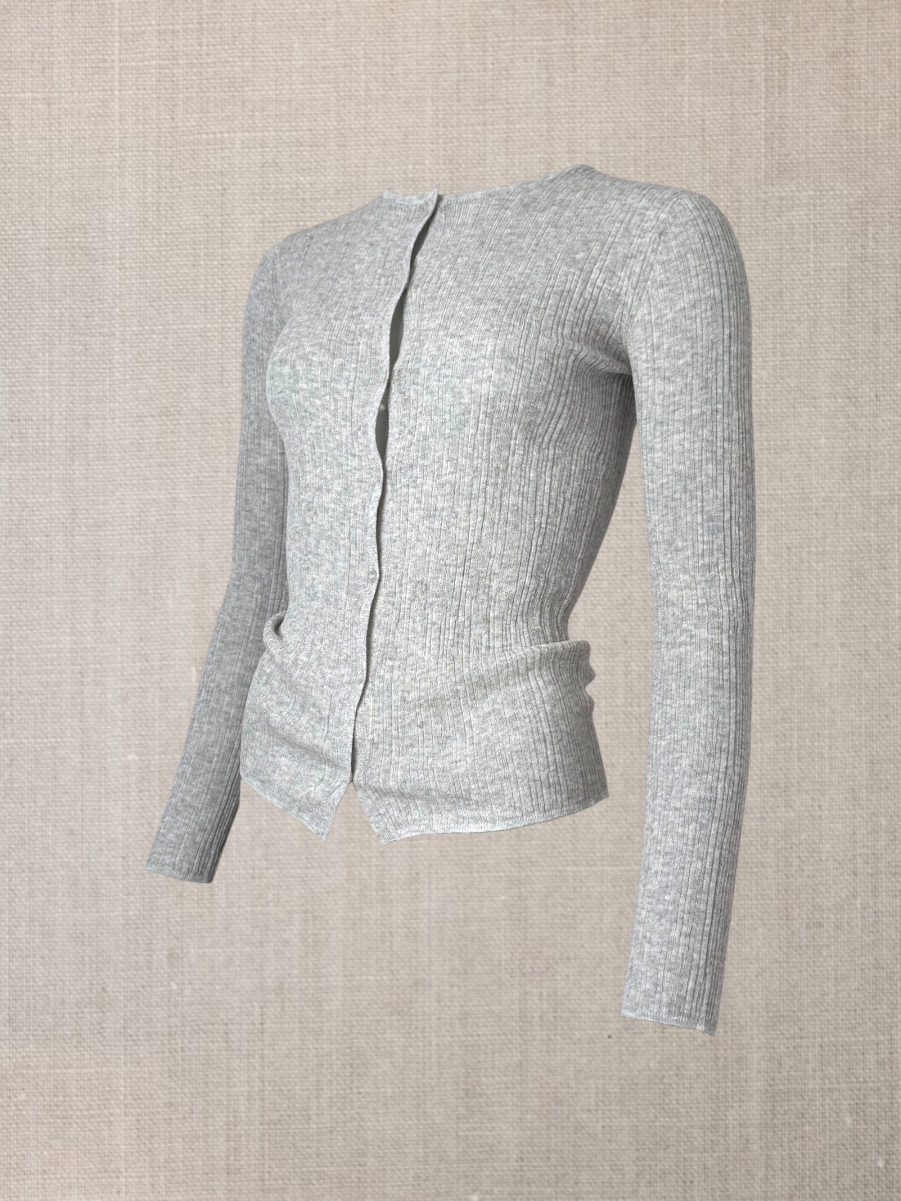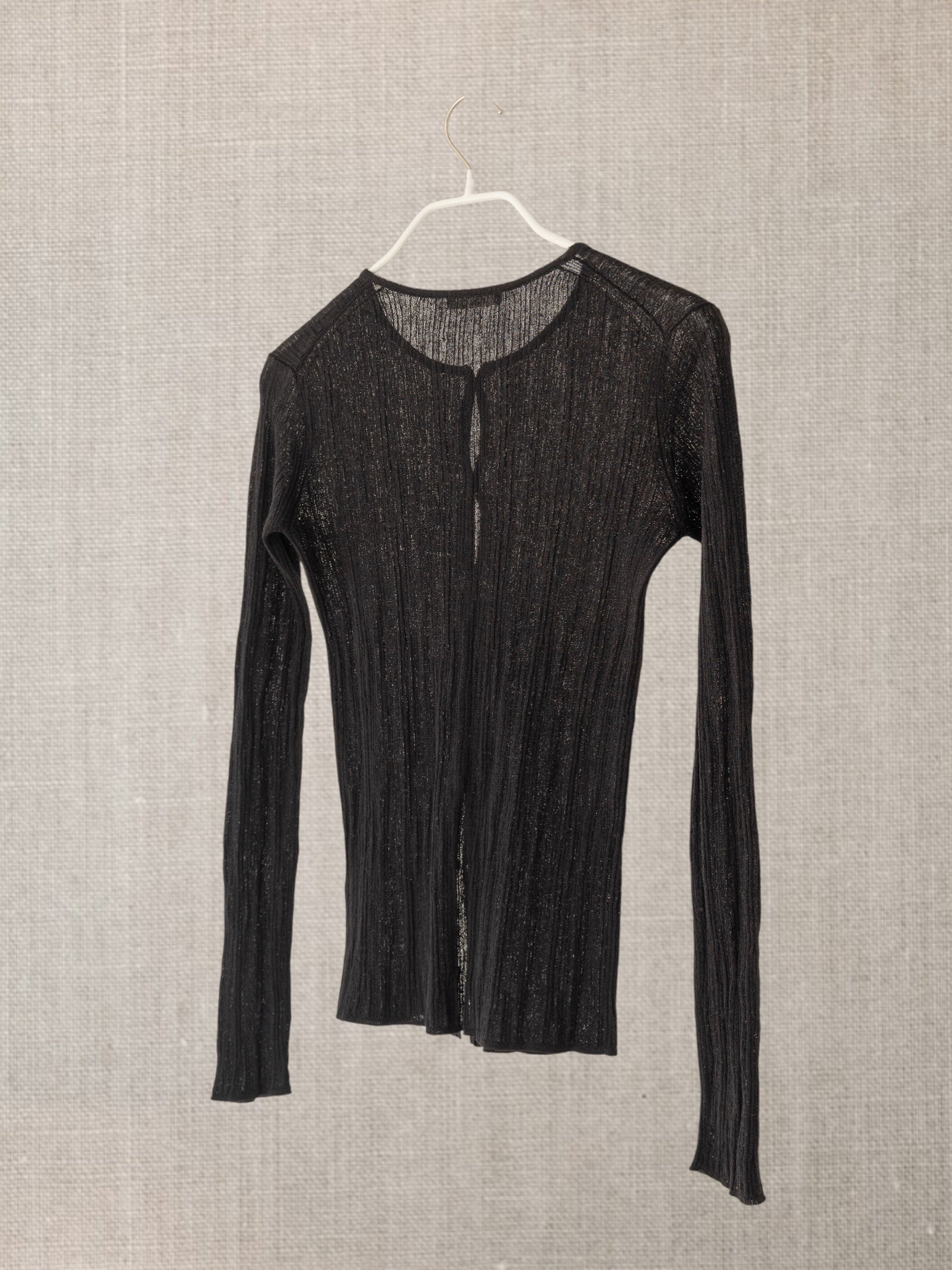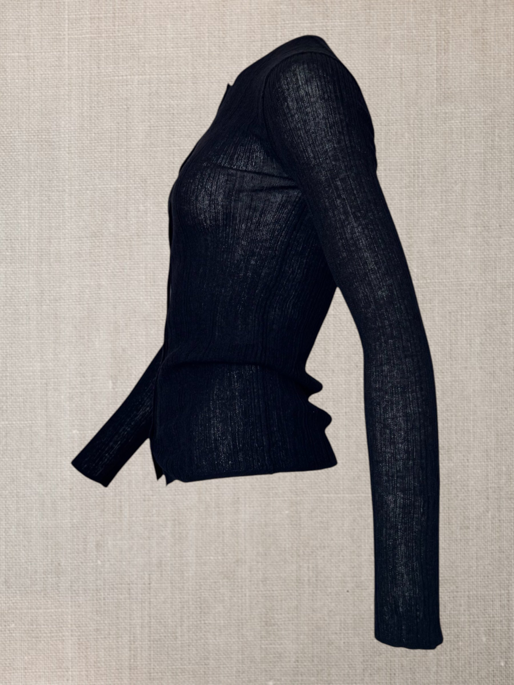 Son tricot côtelé irrégulier allonge la ligne du corps tout en l’accompagnant,