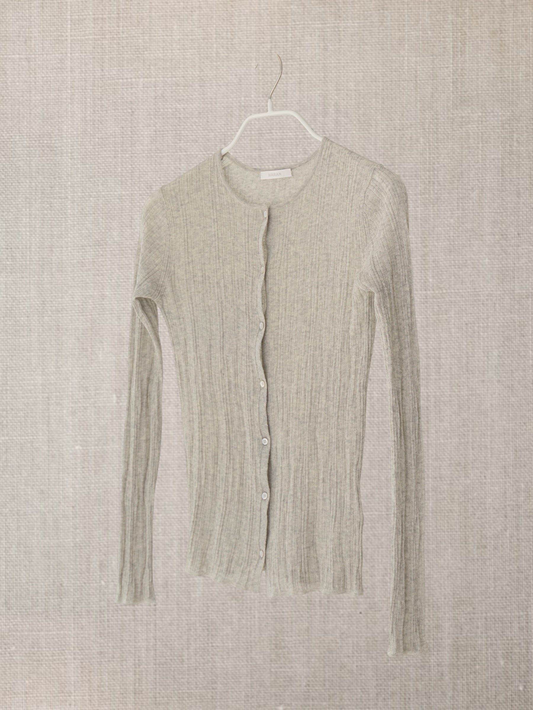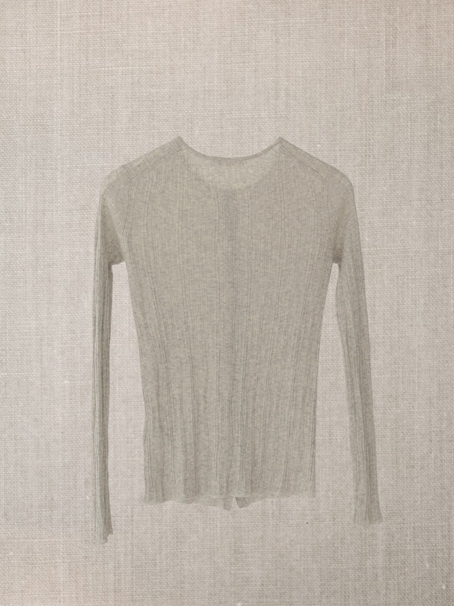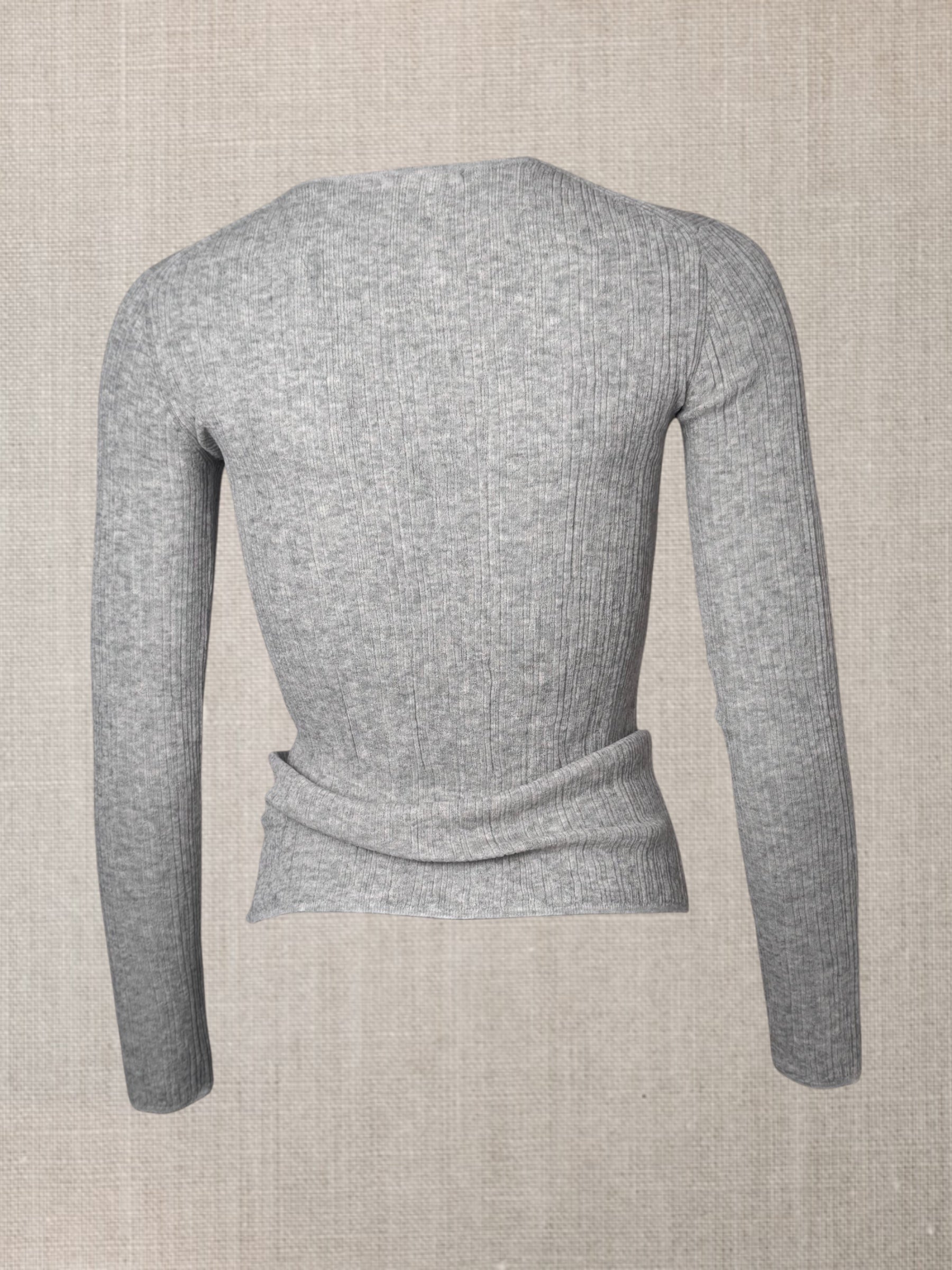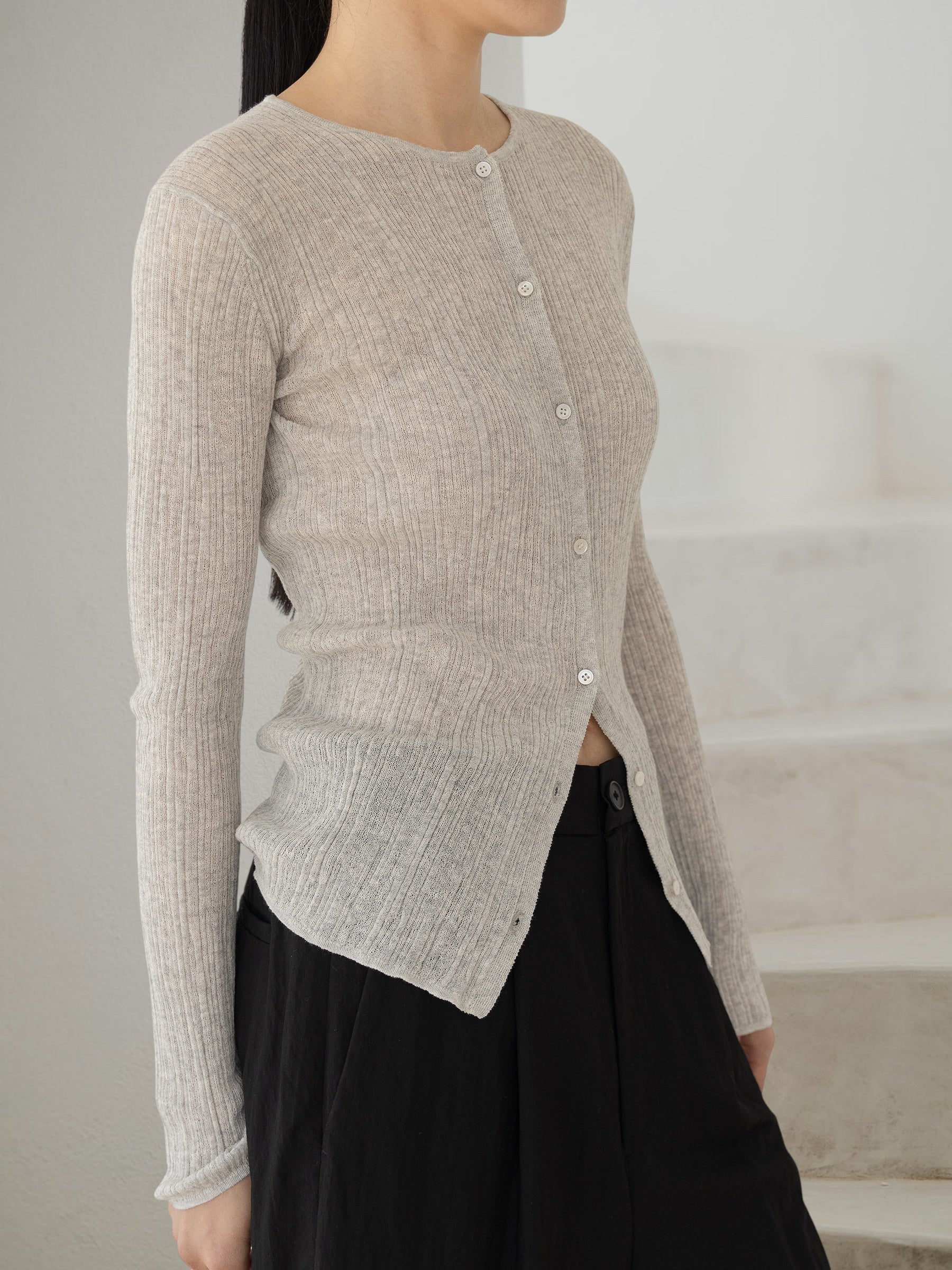 Son tricot côtelé irrégulier allonge la ligne du corps tout en l’accompagnant,