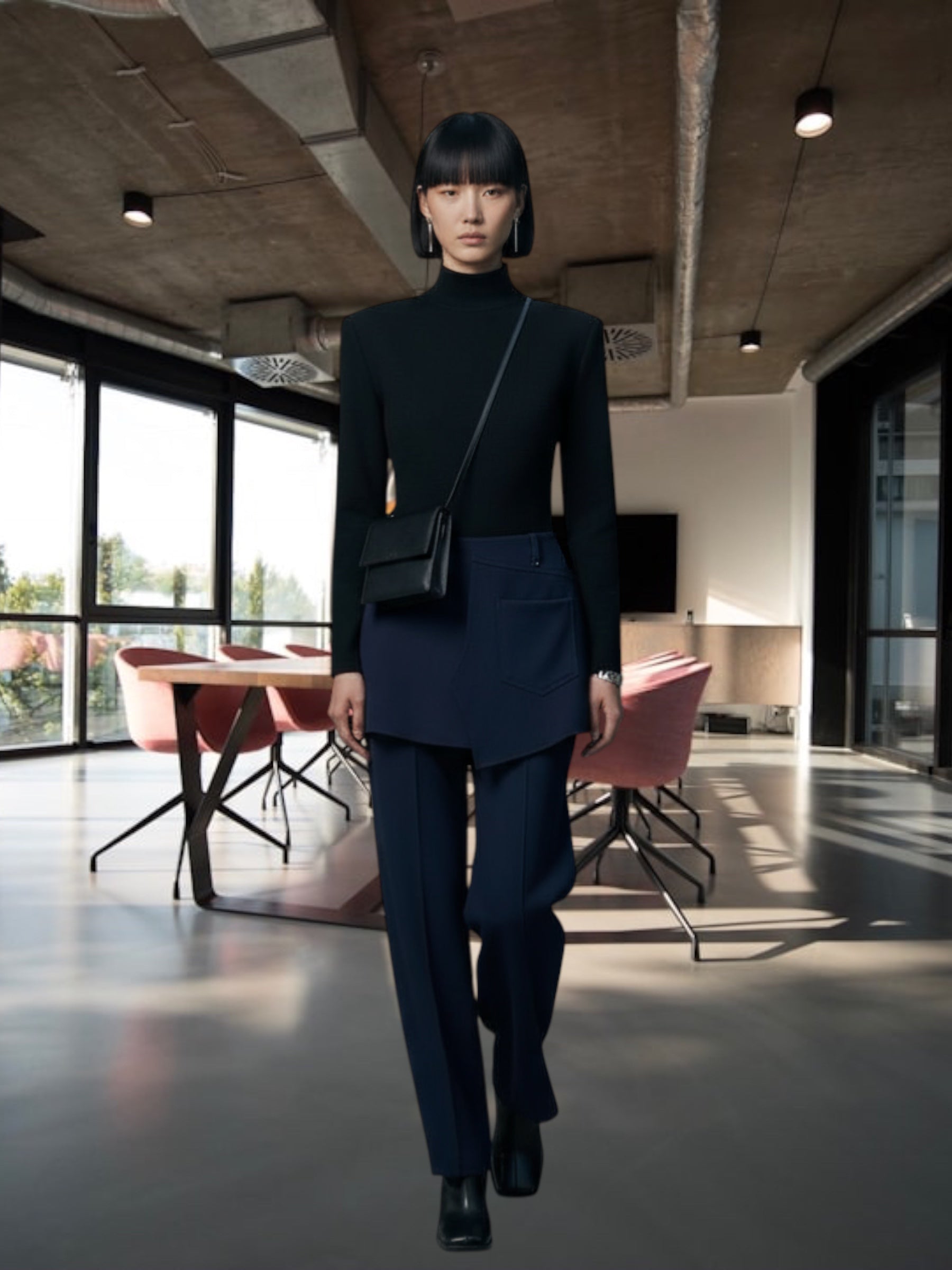 La jupe asymétrique créée une silhouette fluide et structurée.